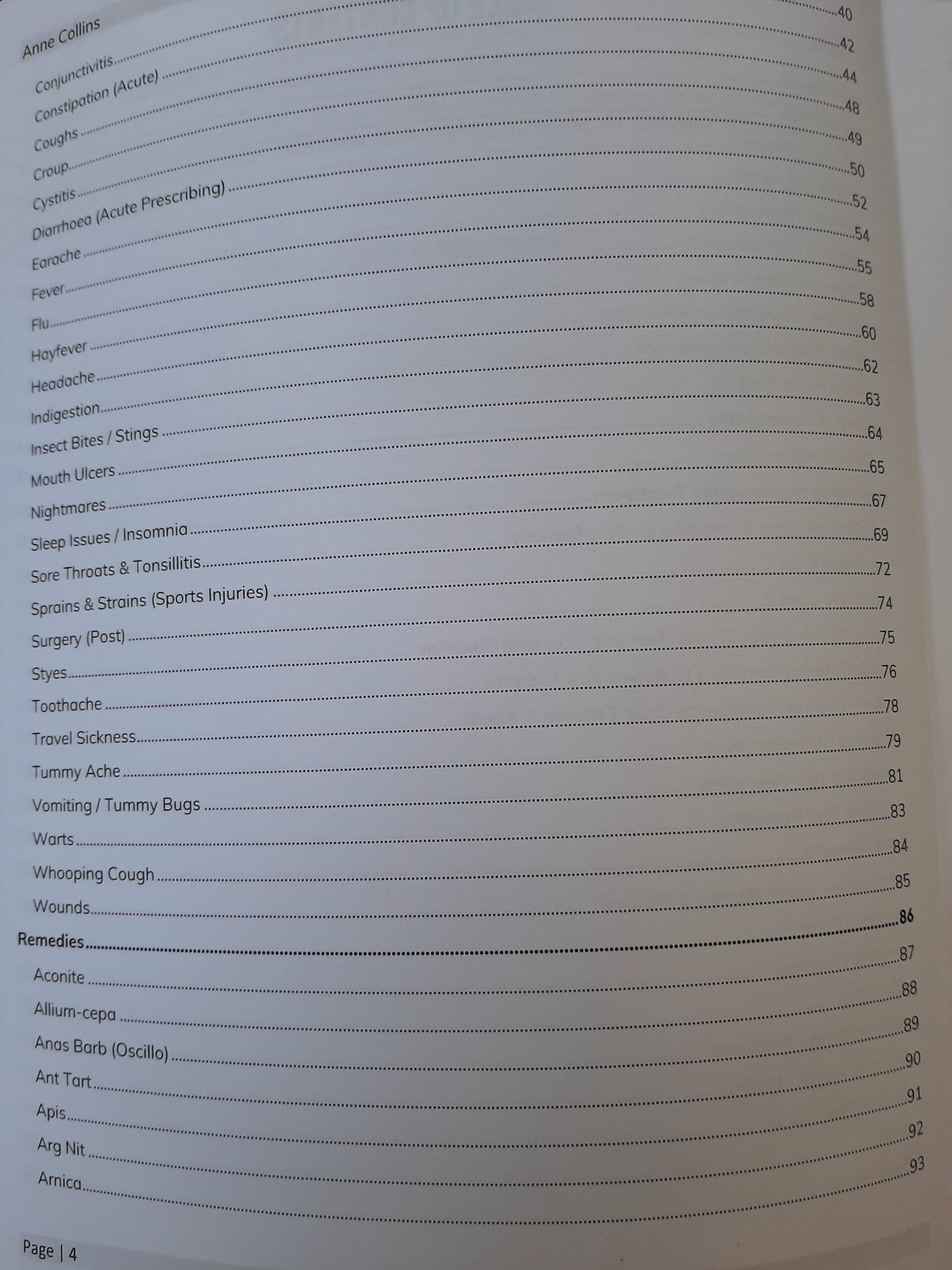 The main part of the book covers the most common everyday acute complaints, such as coughs, colds, flu, tummy bugs, sore throats, and much more, and the corresponding remedies. So you can see at a glance the top most commonly used remedies for each complaint.